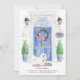 Announce your new address with our stylish announcement featuring a Maltese, blue front door, welcome mat, slate sign, topiaries and a floral wreath set on a grey brick background.