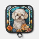 Pot holders featuring a Maltipoo dog artistically done in a stained glass window mode.