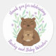 A sweetly illustrated mama and baby bear are flanked by mint green leaves and lilac flowers to look cheerful on this custom baby shower sticker perfect for any party decor need.