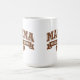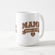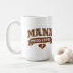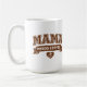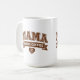 This coffee mug is great for Moms who need caffeine first, before they carry out other tasks for the day. The word "MAMA" is printed in large, "collegiate" style outline text in a coffee brown color, with a brown banner that says "NEEDS COFFEE." Underneath, there's a heart with a coffee bean in it. This humorous mug might make people smile, as you pour your morning java or evening cuppa. The design is the same on both sides.