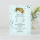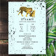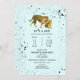 A baby shower invitation featuring an illustration of a baby and mama tiger surrounded by black paint splatter over light blue background.