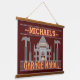 This funny, personalised hanging tapestry is perfect for decorating your man cave. It says, "[Your Name] Garage Mahal" and shows an outline of the Taj Mahal with hammers, screwdrivers and a little car that looks like it's parked in the middle. Easily add your name to the top. The colours are red, grey, and orange.