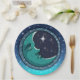 Blue crescent moon with the face of a sleeping man in a starry night sky. Part of his face is lit up by a bight white shining star. The design is set inside a blue circle border with small white and blue dots.