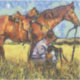 Illustration in van Gogh's painting style, showing a scene in the field of a home cuddling his dog next to his horse.
