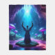 Man In Flowing Robes Raises Arms Upward Towards Glowing Orb Fleece Blanket. Large Mushrooms Are Scattered About The Cave He Is In
