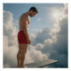A man in bright red shorts stands boldly on a diving board high among the clouds, bathed in warm sunlight that enhances the sense of exhilaration and serenity