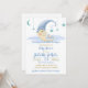 This baby shower is simply beautiful to send to all your friends and family announcing the information on your special upcoming baby shower event. Featuring: a cute cartoon man on the moon holding the sleeping baby, baby blue stars and blue fairy dust.