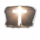 Inspirational faith-based concept art of a man silhouette running on a path towards the giant bright Cross carved into a massive rock.