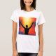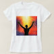 Introducing our stunning "Sunrise Salutation" Women's T-Shirt, where art and style unite to make a bold statement. This shirt features a captivating graphic of a silhouette of a man with his arms raised towards the sun, creating a striking visual that symbolises hope, vitality, and a connection with the cosmos.