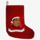 Christmas stocking with illustration of a African American or Hispanic man with short black hair and red Santa Claus hat; in red circle on red background, with customisable text template for your name or message