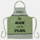 Comical "The MAN with the PLAN" text on a background of avocado green linen and green gingham check plaid and trimmed in black. Every man has a "Plan" mapped out in his head when he goes out to the barbecue grill of what to cook first, for how long, etc. It's like a control thing. Because he IS the Grill Master! And Lord help any wife who goes out and tells him differently! He'll love this apron that just confirms what he already knows. He IS the MAN and he HAS the PLAN!! He'll love wearing this when friends come over for a barbecue! Great gift for Father's Day or his birthday.