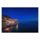 Photo print of the small town Manarola, 1 of the famous five Cinque Terre hill towns, built upon a cliff overlooking the Mediterranean Sea, with the lights on during Blue Hour in the beginning of the night in Liguria, Italy.