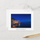 Postcard of the small town Manarola, 1 of the famous five Cinque Terre hill towns, built upon a cliff overlooking the Mediterranean Sea, with the lights on during Blue Hour in the beginning of the night in Liguria, Italy with a white border and the text 'Manarola'.