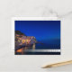 Postcard of the small town Manarola, 1 of the famous five Cinque Terre hill towns, built upon a cliff overlooking the Mediterranean Sea, with the lights on during Blue Hour in the beginning of the night in Liguria, Italy with a fading white bar and the text 'Cinque Terre'.