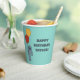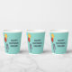 Par-tee like a manatee with custom party cups. These paper cups feature an illustration of a grey cartoon manatee holding red and yellow balloons against a light blue background. These cups are ready to be personalised with your own message.