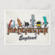 The City of Manchester, England, featuring a stylised cartoon character versions of its landmarks and cityscape, including (from left to right) Manchester's football clubs (United and City), Manchester Town Hall, a vinyl record from Factory Records, Deansgate Square, a Metrolink tram, and the Beetham Tower. Manchester is spelled out in traditional red brick and sandstone, with cotton flower embellishment.