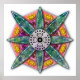 This Mandala Design shows a Flower with 8 green pointy petals. The main colours in this Mandala are green, red, yellow, pink.