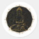 Buddha mandala sticker design featuring an illustration of a buddha in shape of mandala in golden aparkly lines.