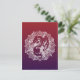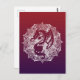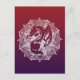 a decorative mandala circle design featuring lots of geometric ornamental elements and the silhouette or the shadow of mythical dragon or lizard on a red to purple coloured postcard.