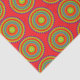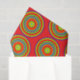 A mandala circle pattern with red, yellow, blue and green colours on a red background colour. You can change the background colour.