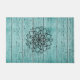 Black linear mandala graphic with weathered blue wood background makes this a welcoming mat for almost anyone