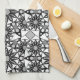 Kitchen towel in a twelve point mandala pattern in shades of graphite and silver grey, accented with black and white