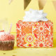 Twelve point mandala pattern gift wrap in shades of deep to medium coral orange with mustard gold and white accents