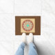 Doormat in a mandala pattern in shades of tan, beige, caramel and chocolate brown, accented with turquoise, on caramel tan with a chocolate brown border