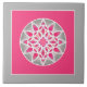 Ceramic tile in a twelve point mandala pattern in shades of fuchsia pink, white and soft grey