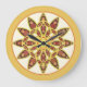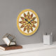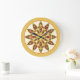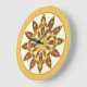 Twelve point mandala pattern in shades of chocolate brown, mustard gold, and dark brown on white, with a gold background