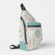Mandala pattern sling bag in peach, teal, orange and white with optional personalisation with a monogram in your choice of font styles, size and colour with coordinating solid teal accents. Change or delete the sample text and circle frame in EDIT. ASSISTANCE:  For help with design modification or personalisation or if you would like coordinating items, contact the designer BEFORE ORDERING via the Zazzle Chat MESSAGE tab below or email makeitaboutyoustore@gmail.com.