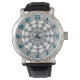 A two-tone blue numerical clock face on a black and white circular scroll-like mandala pattern embedded with stars, swirls and sunbursts and circles.