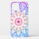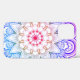 A white phone case with a mandala design that transitions from purple at the top to blue at the bottom, with a central flower-like pattern in red, orange, and white.