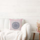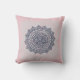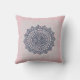 Throw Pillow with dark blue mandala graphic illustration on pink background.