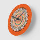This decorative wall clock featuring a vibrant, geometric design. The clock face is predominantly orange, with a series of concentric zigzag patterns radiating outward. These patterns include various colors such as red, brown, black, and cream, creating a visually striking effect. The clock hands are black, contrasting with the colorful background, and the overall design gives a modern and artistic feel, making it a stylish decorative piece for any room.