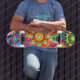 This colourful skateboard deck features mandalas in a floral, psychedelic design. A skateboard that is sure to turn heads and impress fellow boarders at the skate park.