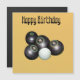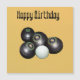 Pictured on mandarin yellow are four black lawn bowls and jack with a happy birthday
