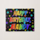 This exciting, fun, birthday-themed jigsaw puzzle design features the message "HAPPY BIRTHDAY, MANDY" with the characters having a colorful rainbow spectrum inspired gradient pattern, along with a vibrant star field background pattern. An exciting puzzle like this might be used to send birthday greetings to somebody named Mandy. [~Z0000468]