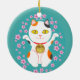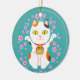 Teal ornament with Japanese maneki-neko lucky black cat surrounded by cherry blossoms. The Japanese writing on the medallion around the cat's neck means prosperity. The calico maneki-neko is the luckiest of all, and this cat is beckoning with two paws, making it a very powerful symbol of good luck.