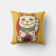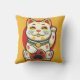 The Maneki Neko is predominantly white with patches of yellow and red, adding a lively and colourful touch to the design. It wears a green collar adorned with a gold bell, symbolising wealth and prosperity. The cat holds a large, red coin with black paw prints, further emphasizing its role as a bringer of luck and good fortune.