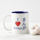 This "I love manga" or "I Heart manga" design has a modern comic style purple font and a red heart. It also shows the word "manga" in Japanese Hiragana lilac font.