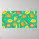 Mango. Seamless pattern with yellow and red tropical fruits and pieces on green background. Bright summer vintage illustration.