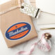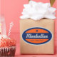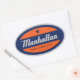 Oval signage design featuring the neighbourhoods of New York City. Official orange and blue colours of NYC. New York City borough of Manhattan.