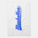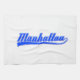 Manhattan, New York City, written with a swash (tail). Fonts in white and blue. Original text design.