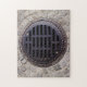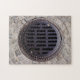 Features an antique manhole cover grate nestled in an old cobblestone road. Rustic and refined with old world charm.