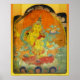 Manjushri on wood panel, Kathmandu, Nepal. Manjushri is portrayed as a beautiful 16-year-old prince. He holds in his left hand the stem of a blue lotus blossom on which rests one of the Prajnaparamita scriptures, which deal with the realisation of Prajna, or wisdom. With his right hand he wields a flaming sword of wisdom to vanquish ignorance.