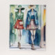 Jigsaw puzzle. Two fashionably dressed mannequins wearing hats and mini skirts walk confidently in front of a colourful background.