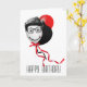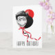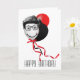 Man's smiling face with hair and black glasses on red, black and white birthday balloons bouquet.