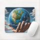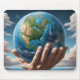 A pair of hands cradles a strikingly detailed and vibrant representation of Earth against a backdrop of a vast sky and distant horizons