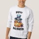This spooky sweatshirt is perfect for any Halloween lover. The front features a large, detailed image of a scary skeleton wearing a top hat and surrounded by pumpkins. Says Happy Halloween. Perfect for lounging at home, passing out candy, or being worn as a Halloween costume at a Halloween Party.